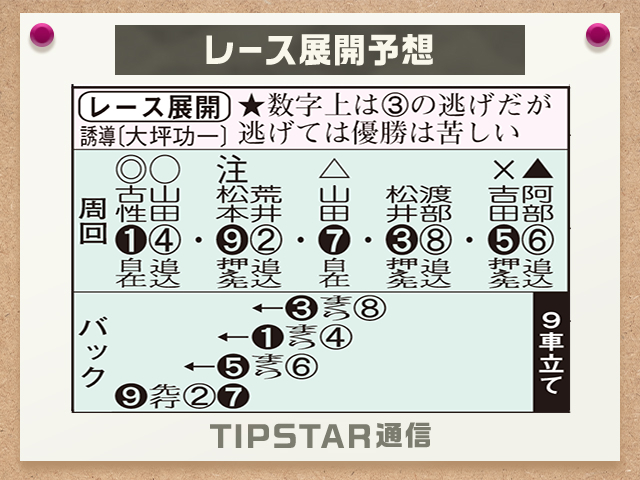 スタートが早い①古性は前を欲しがるでしょう。そこからは車番順。⑨松本が前中団で③松井が後ろ中団。⑤吉田は後ろに置かれそうで⑦山田もいったんは最後方からとなるでしょう。