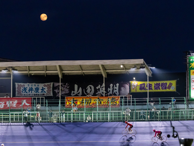ナイター開催のオールスター競輪は、レース後半になると日はすっかり暮れている。夜空にぽっかり浮かぶ丸い月が印象的。こんな真夏の夜の競輪観戦もオツなもの。(編集M・U)