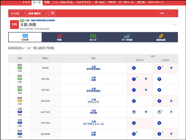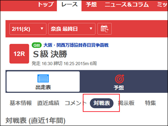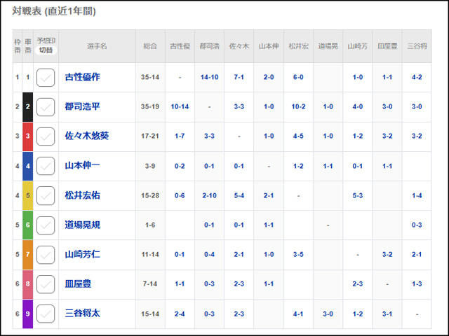 なお、全出場選手の対戦成績は、netkeirinの「出走表」から見ることができる。各レースの「出走表」という表示の下にある「対戦表」をクリックすれば、そのレースに出走する選手同士の直近1年間の対戦詳細を見ることができる。車券戦略にぜひ活用してほしい。
