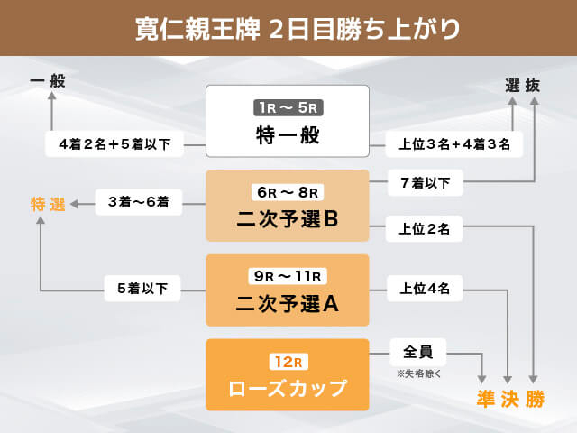 1〜5R | 特一般 | ・選抜…1〜3着+4着3名 ・一般…4着2名+5着以下 | 1R 2R 3R 4R 5R |