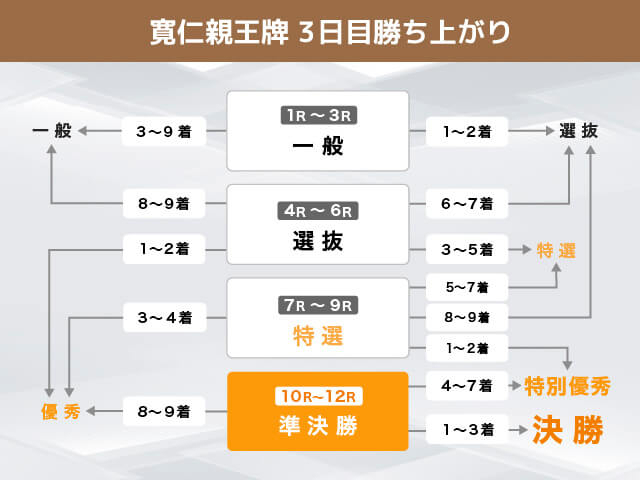 | 10〜12R | 準決勝 | ・決勝…1〜3着 ・特別優秀…4〜7着 ・優秀…8着以下 | 10R 11R 12R |