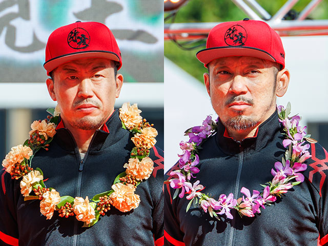 お次は決勝12Rの出場選手特別紹介の特別ショット。勝負へのメラメラとした闘争心を燃やす男たちの首元に、可愛らしい花が…。引き締まった表情とのギャップがいいコントラスト。