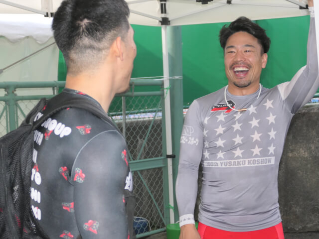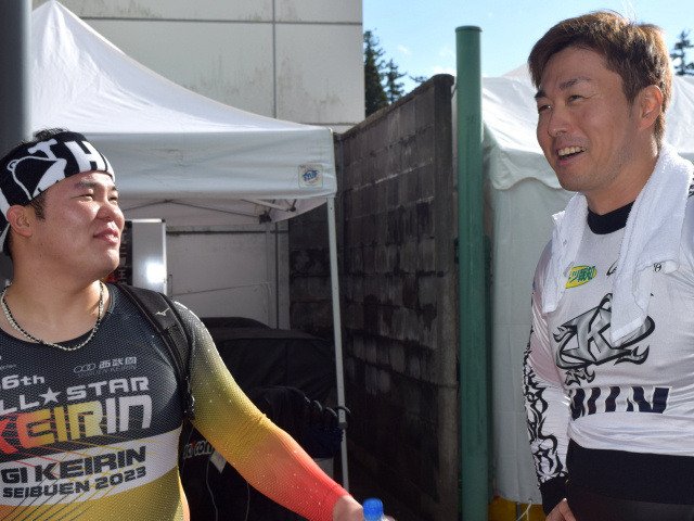 2024年初日を終え、ローズカップのインタビュー前の古性優作と寺崎浩平。古性は手を挙げてスマイル炸裂、屈託のないいい笑顔である。それを見る寺崎浩平、カメラに背を向けながらも頬が上がっているのがわかる。なんだか微笑ましい一枚だ。