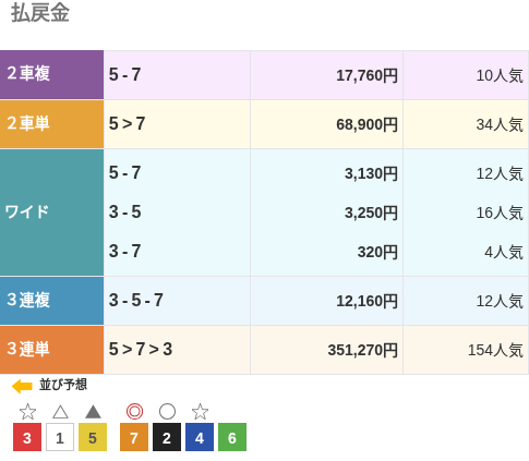 3連単は⑤-⑦-③で351,270円という配当で、154番人気の組み合わせ