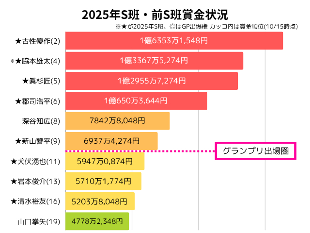 まずS班の中で現状グランプリ圏内に位置しているのは古性優作、眞杉匠、脇本雄太、郡司浩平、新山響平の5人だ。