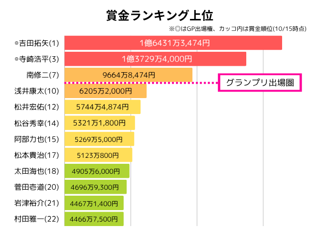 賞金ボーダー上で争っていた南が10位と約3400万円の差をつけグランプリは決定的となりこれで残る切符は2枚。ここからは現在上位を走る有力選手は安泰なのか、そして残りの枠に滑り込む可能性を秘める選手を取り上げていく。