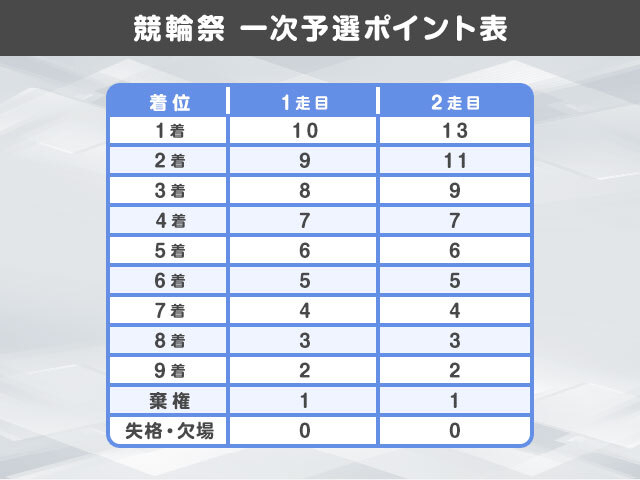 競輪祭の一次予選はポイント制の勝ち上がりだ。S班であっても特選などのシードはなく、108人全員が一次予選を2走し、勝ち上がりを競う。着に応じて与えられるポイントは以下の通り。