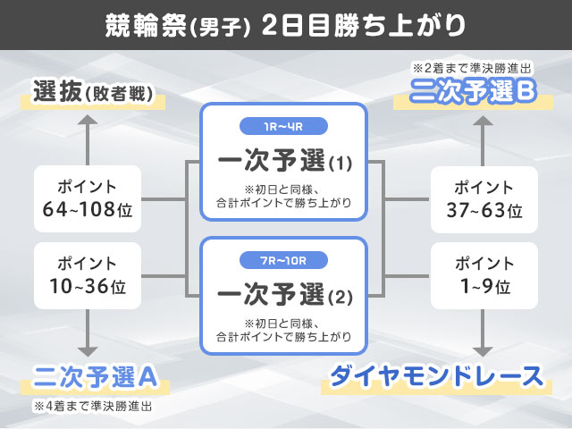 一次予選は3日間で2走を走り、獲得したポイントの合計によって勝ち上がりが決まる。2日目はは第1〜4Rが一次予選1走目、第7〜10Rが一次予選2走目。