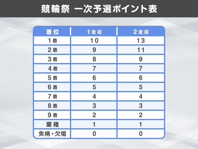 一次予選の付与ポイントは以下の通りで、2走目のほうが上位ポイントが高く設定されている。1走目で大敗を喫した選手は確定板が必須条件といえそうだ。