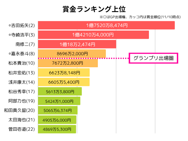 タイトル争いに加えて賞金争いも激しくボーダー付近は大混戦、目まぐるしく変動するグランプリ争いを今一度整理していこう。