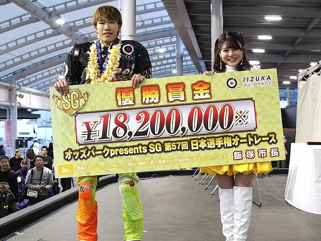 飯塚の新スタンドから大観衆が見守る中、優勝戦がスタート。有吉が主導権を握り、2番手で鈴木宏和、さらに佐藤励が3番手に付ける。佐藤は2周回目に鈴木をかわして2番手に上がると、有吉との差を詰めて、8周回目に有吉をとらえて先頭に躍り出て、そのままゴール。今年4月に川口のオールスターでSG初優勝した佐藤は、今回2回目のSG優出で、2回目のSG優勝。もちろん日本選手権は初制覇となった。「僕みたいな若手が出てきて、オートレースはもっともっと面白くなる。年末へもっとレベルアップしていきたい」と、優勝インタビューでもさらなる飛躍を誓った。
